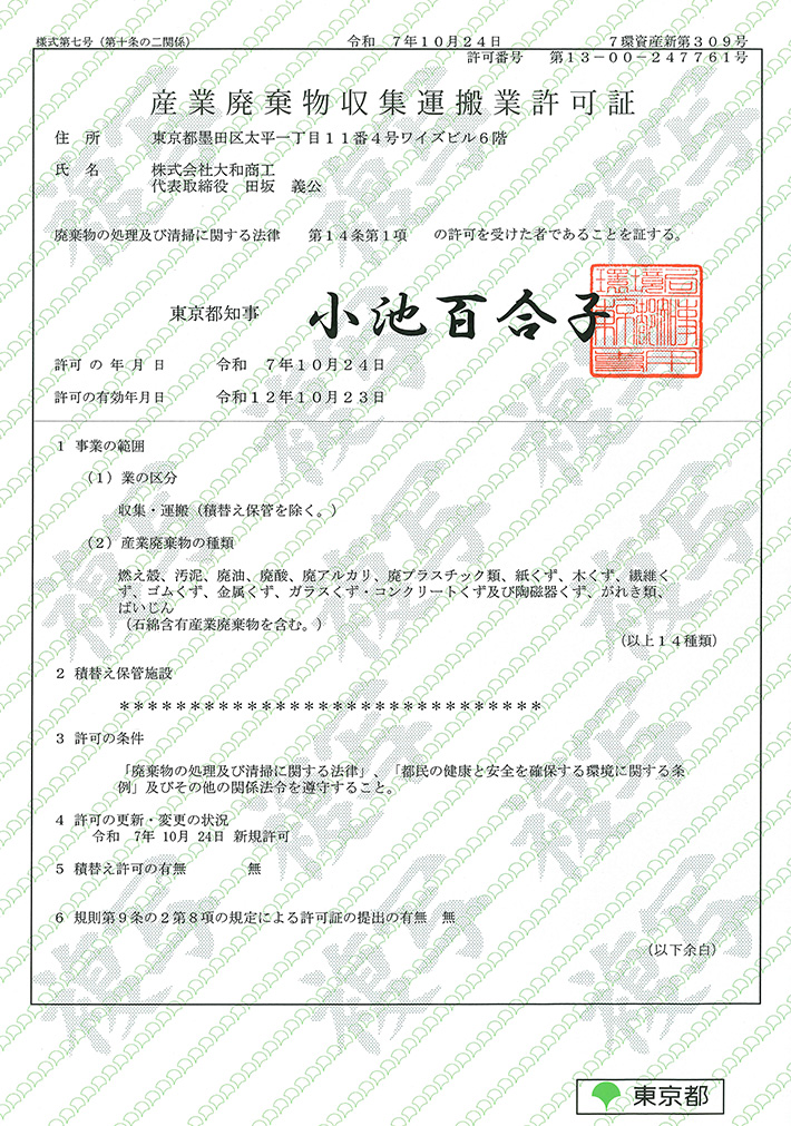 東京都産業廃棄物収集運搬業 許認可取得のお知らせ news 2025.10.25 実りの秋を迎え、朝晩の涼しさを感じる季節となりました。皆さまにおかれましては、平素は格別のご高配を賜り、厚く御礼申し上げます。 このたび、下記の通り東京都の産業廃棄物に関する許認可を取得いたしましたのでご報告申し上げま す。 【産業廃棄物収集運搬業】 許可番号 第13-00-247761号 今後とも一層のご支援・ご鞭撻を賜りますよう、よろしくお願い申し上げます。
